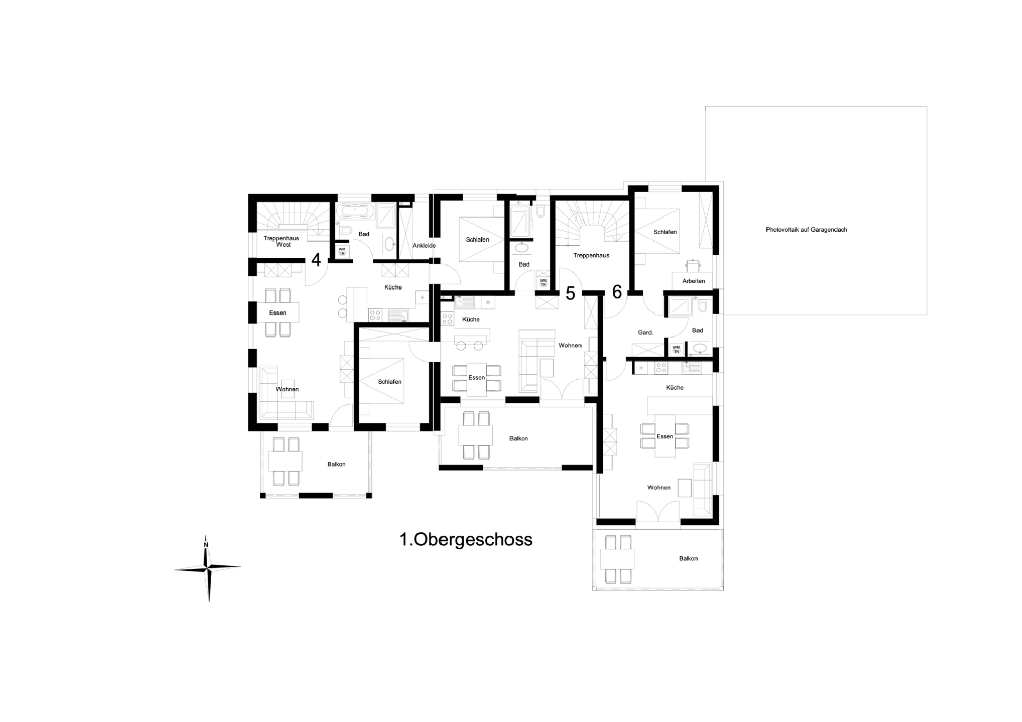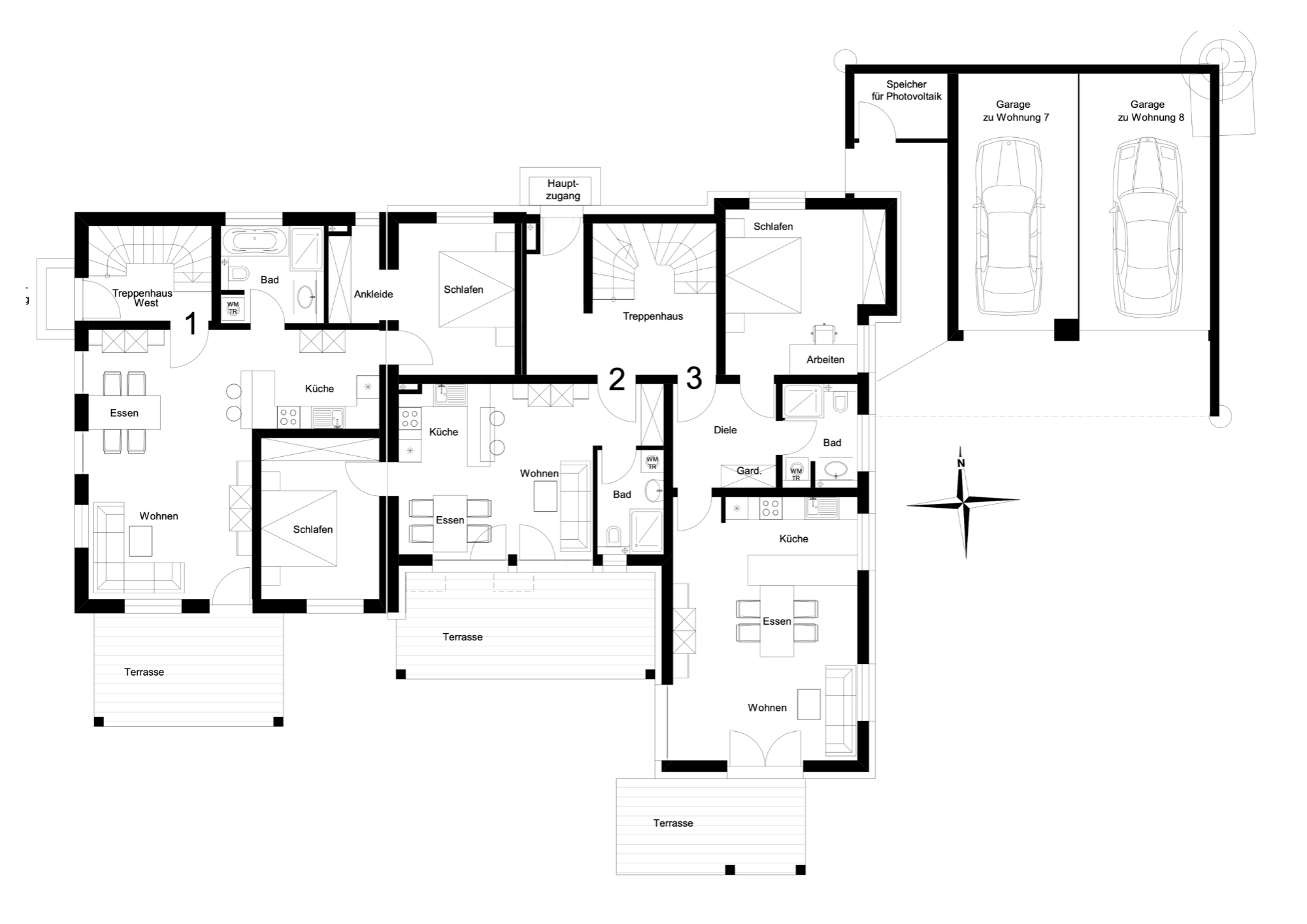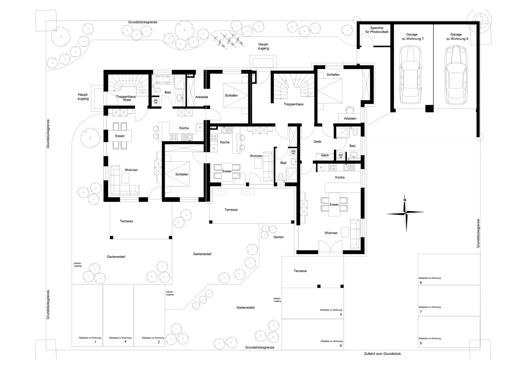 - Stellplätze: 10 – 8 Außen- + 2 Garagenstellplätze