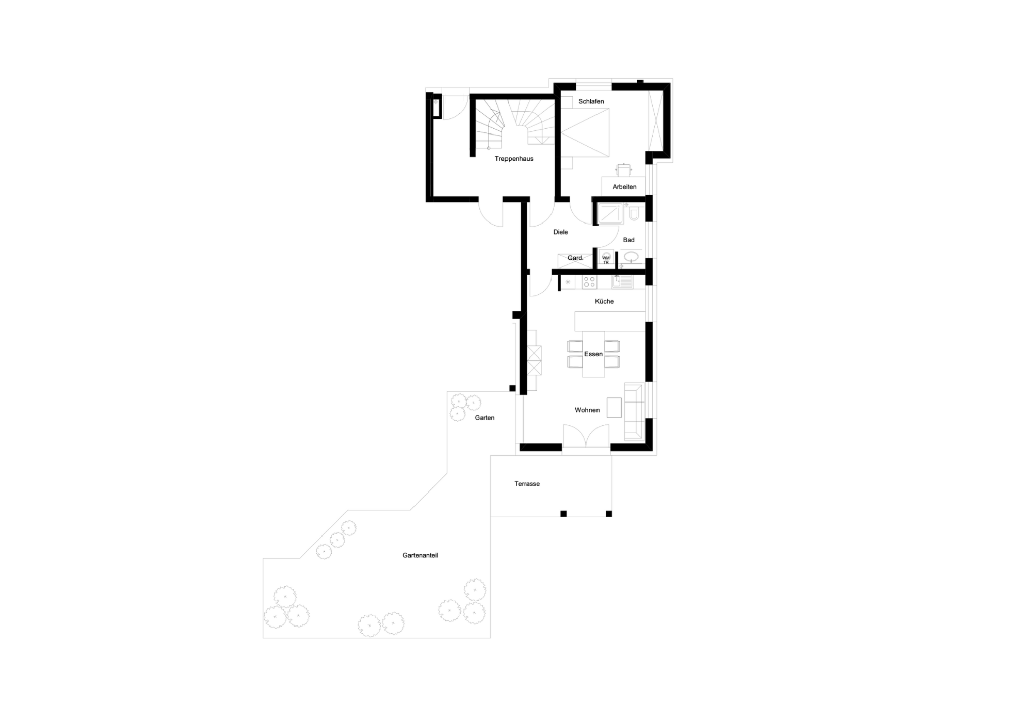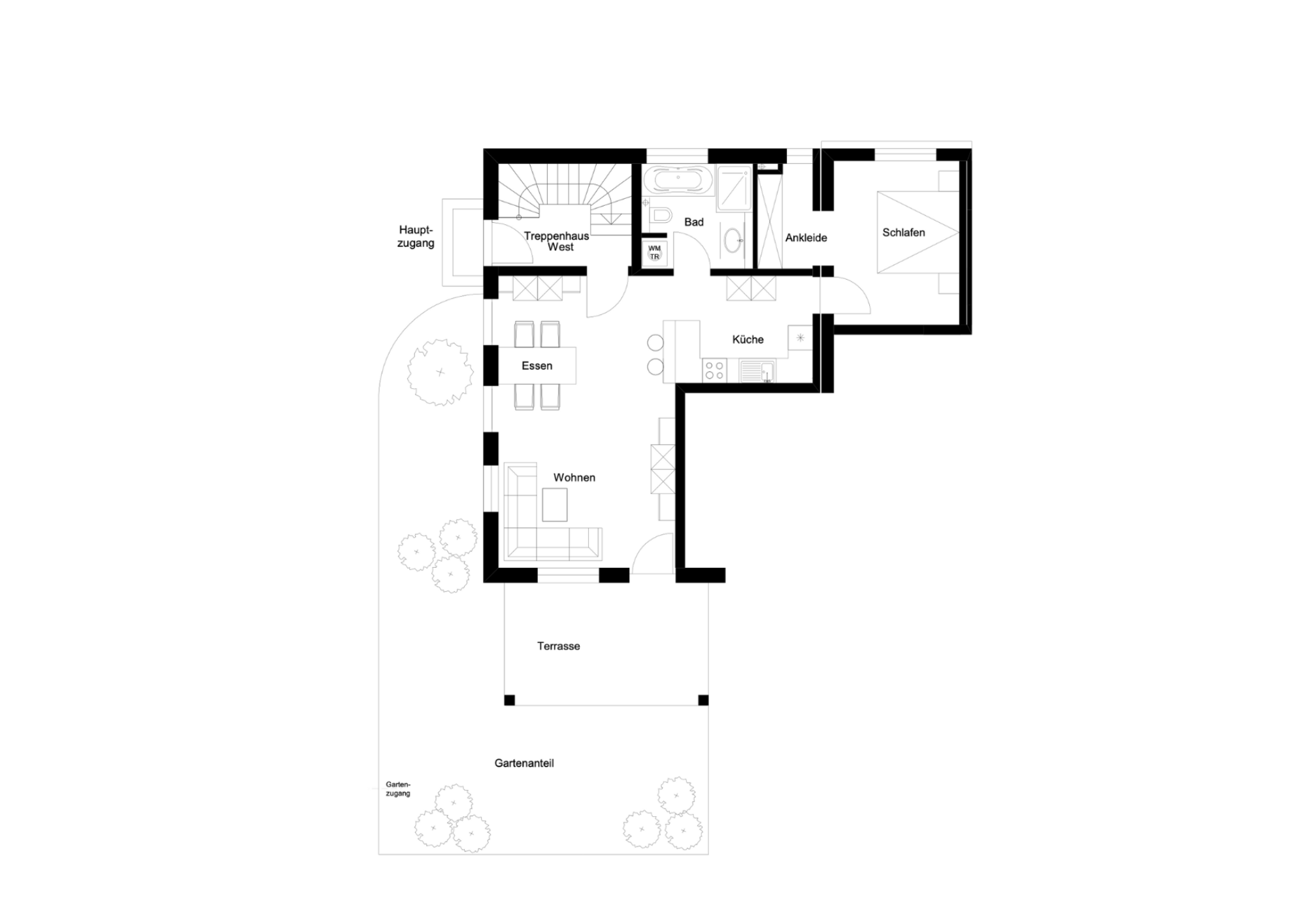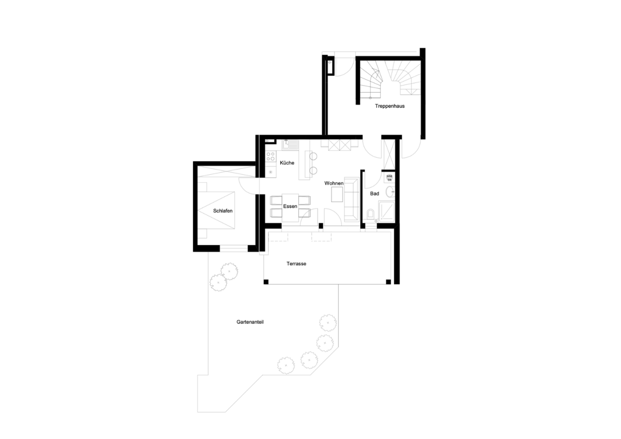 Die Erdgeschosswohnungen besitzen jeweils eine Terrasse mit zugehörigem Gartenanteil.